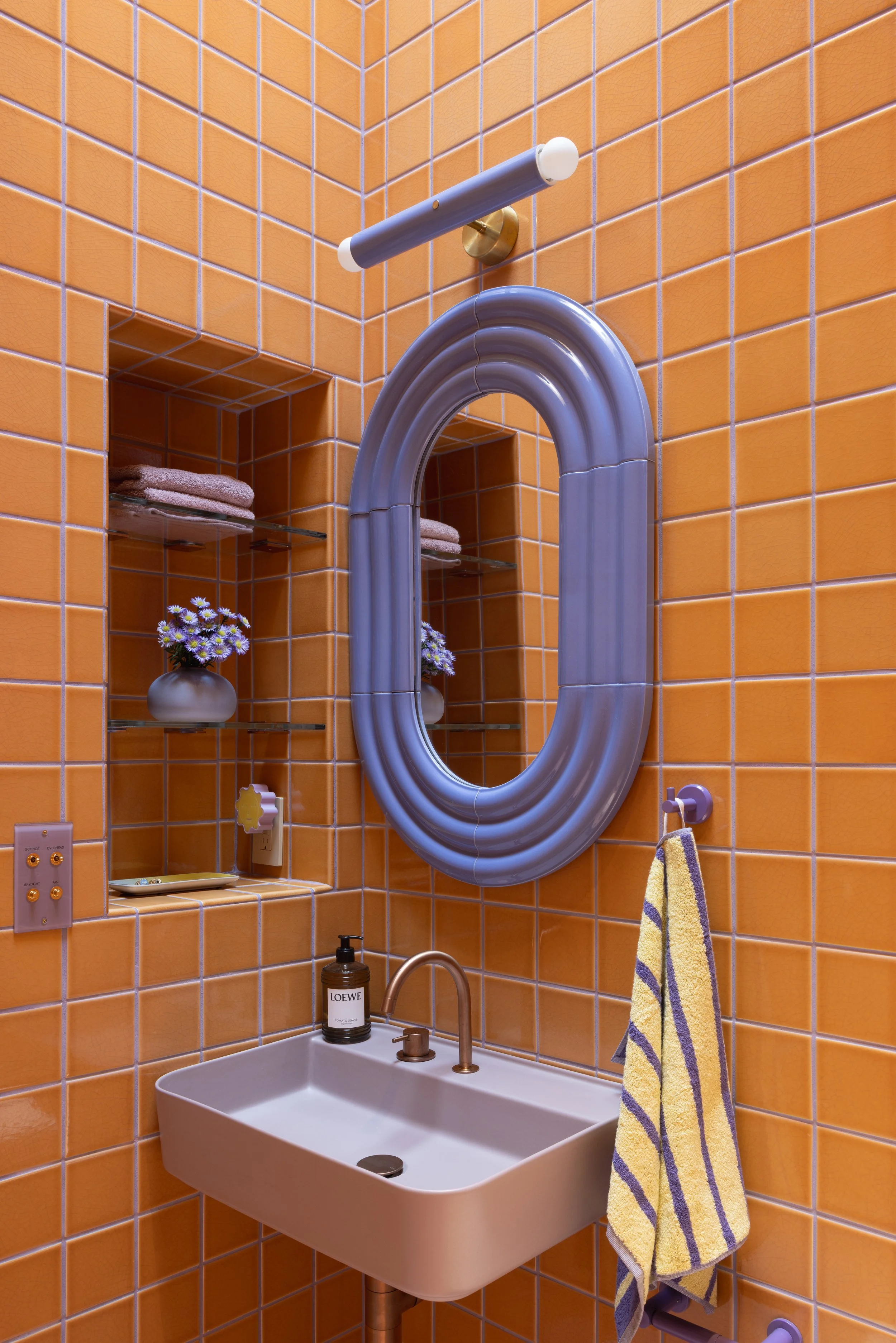 Glossy “Koi” crackle tiles stretch up to the 11 foot ceiling in this orange dreamsicle of a guest bathroom, immersing one in a sunny splash of mandarin with pops of lavender and lilac throughout